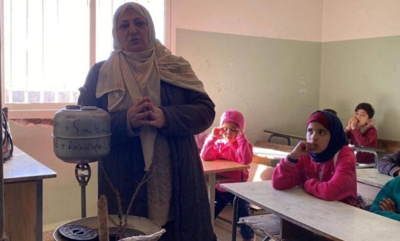 وتشارك المُعلمة سلوى هزيمة، التي تعمل كمتعاقدة منذ 26 سنة في هذه المتوسطة، في المهمة داخل الصف الدراسي. تشكو من إشغال مدافئ المازوت بالحطب دون تأمين الإمدادات اللازمة؛ ما يؤدي إلى تصاعد سحب الدخان داخل غرف التدريس. تقول: «عندما أشعلت إحدى الطالبات بقايا أثاث خشبي مطلي بالدهان، انعدمت الرؤية في الصف وانبعثت روائح الدهان الكيميائية متسببة بالغثيان لبعض الطلاب الذين تفاقمت حالتهم الصحية واضطروا إلى التغيّب عن الصفوف». وتناشد وزير التربية في حكومة تصريف الأعمال عباس الحلبي التدخل لرفع الأذى عن الطلاب.